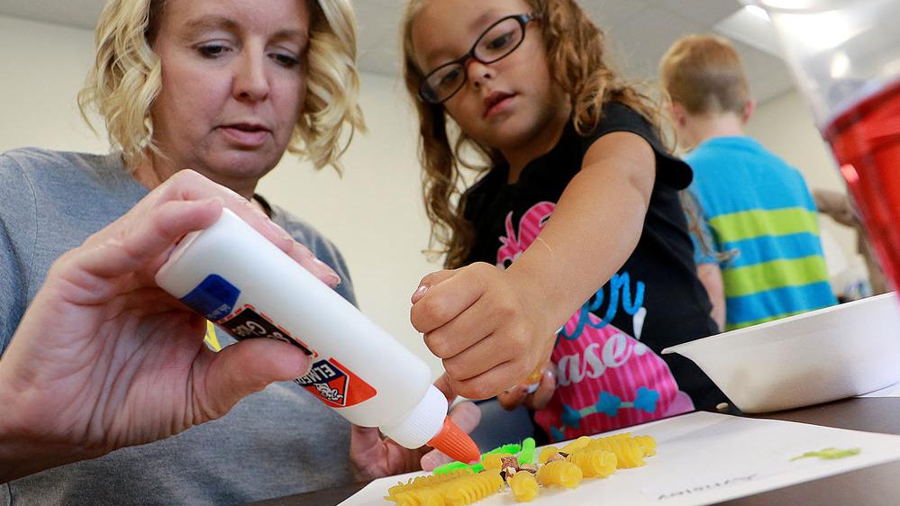 Amy Schledewitz also spent time Friday morning with her son, Decker, 4. Using teamwork, the two squeezed out the glue and secured the noodles, seeds and pipe cleaners to the paper.