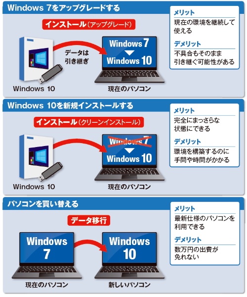 Windows 7パソコンをWindows 10に移行する方法は「Windows 10搭載PCへの買い替え」「Windows 7をWindows 10にアップグレード」「Windows 10を新規インストール」の3通りがある。それぞれにメリットとデメリットがある。